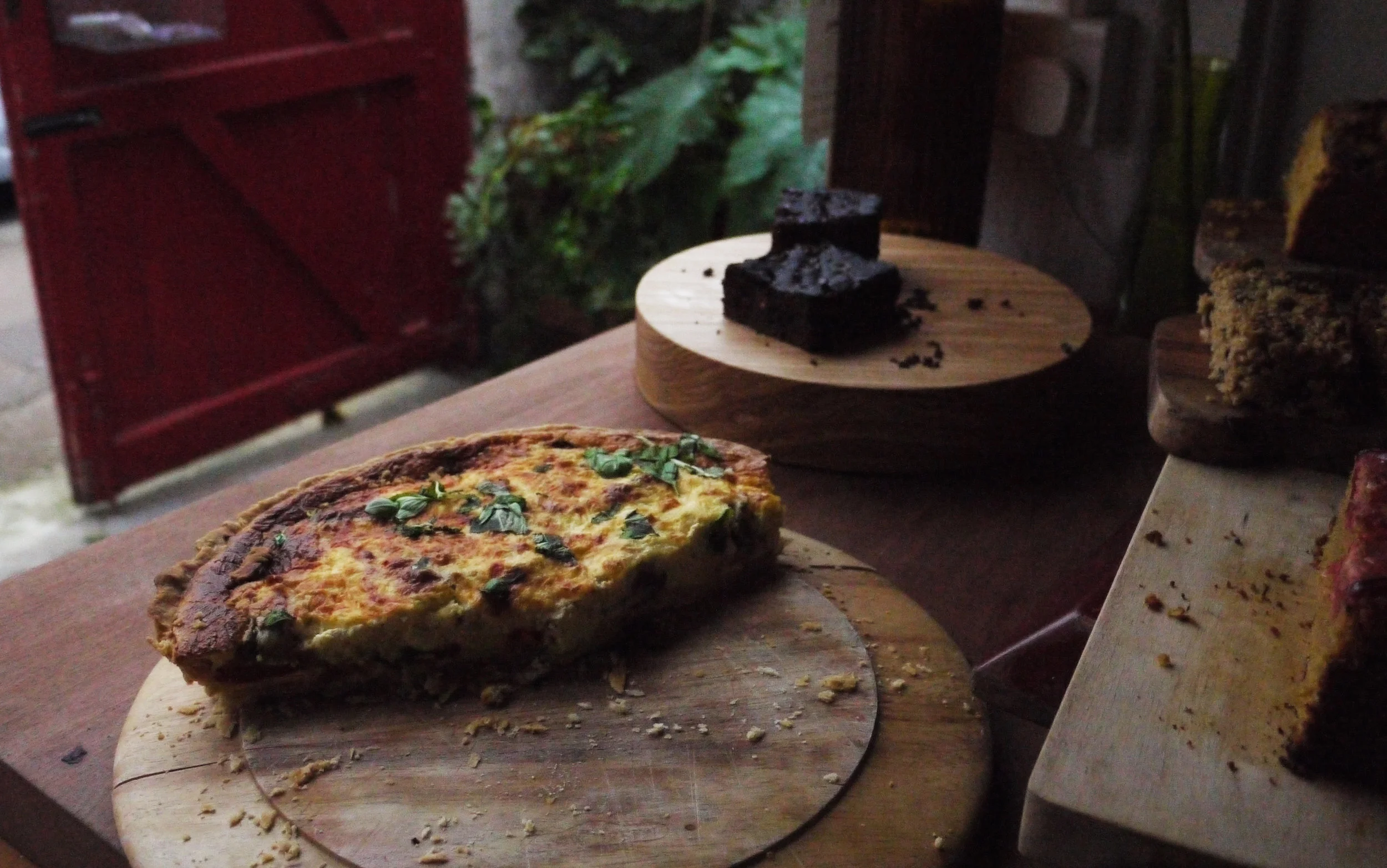 We sell freshly baked loaves of bread, home made Quiches, Salad, cheese toasties with extras like gruyere and truffle if you like, or gherkin and mustard.